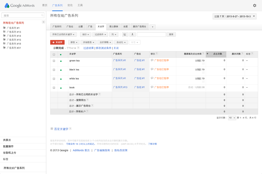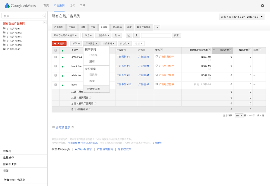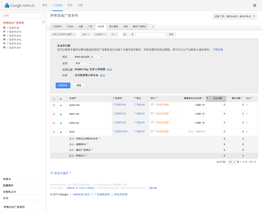 就像所有优秀的管理者都会定期评估员工的表现一样,您可能也希望查看关键字的效果,了解哪些关键字帮助您定位到 Google 搜索网络的广告系列实现了广告目标。为此,您可以查看和下载特定时段内的关键字效果数据,也可以自定义您的AdWords统计信息表格,以按照匹配类型跟踪关键字的效果。您还可以运行关键字诊断,查看您的关键字的质量得分。