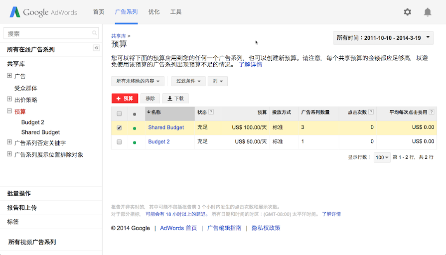 在AdWords中,您可以为每个单独的广告系列指定每日预算,也可以使用共享预算在多个广告系列之间分配预算。如果您没有太多时间来设置和监控单独广告系列的预算,但仍希望广告在设定的预算内获得最多的点击次数,那么共享预算就是理想之选。