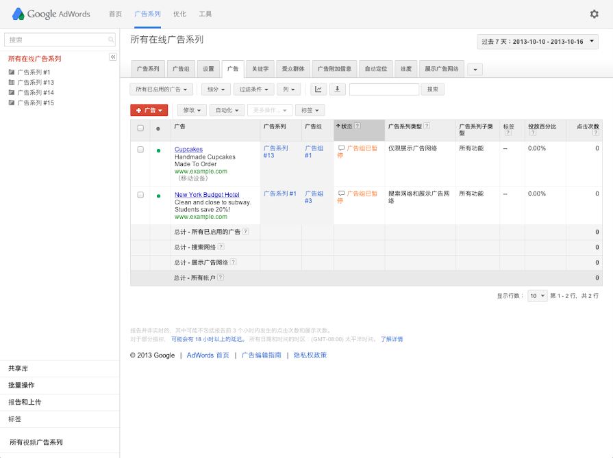 广告标签下的“状态”列可以指示广告是否有效,以及其处于目前状态的原因。广告的状态可以反映您对该广告或其广告系列所做的修改,以及该广告是否已经通过 AdWords 政策审批。