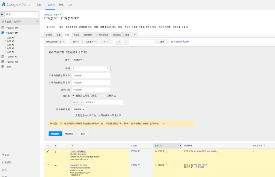 您可以修改您的显示网址和着陆页网址。如果您更改了自己的网站,或者想利用新制作的广告为新网页吸引流量,那么这种方法非常有效。您可以逐个修改网址,也可以批量修改网址。