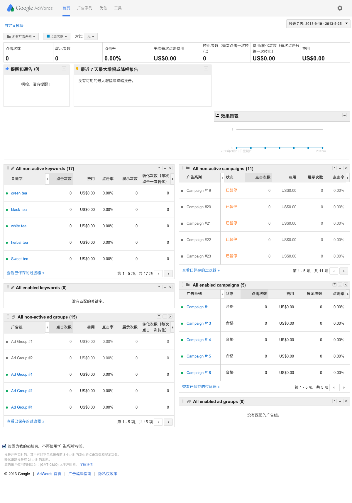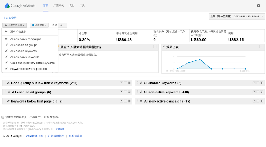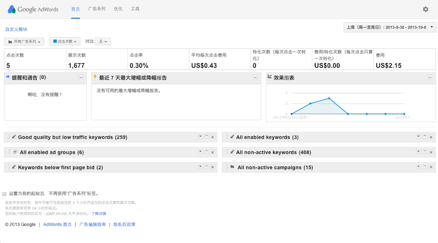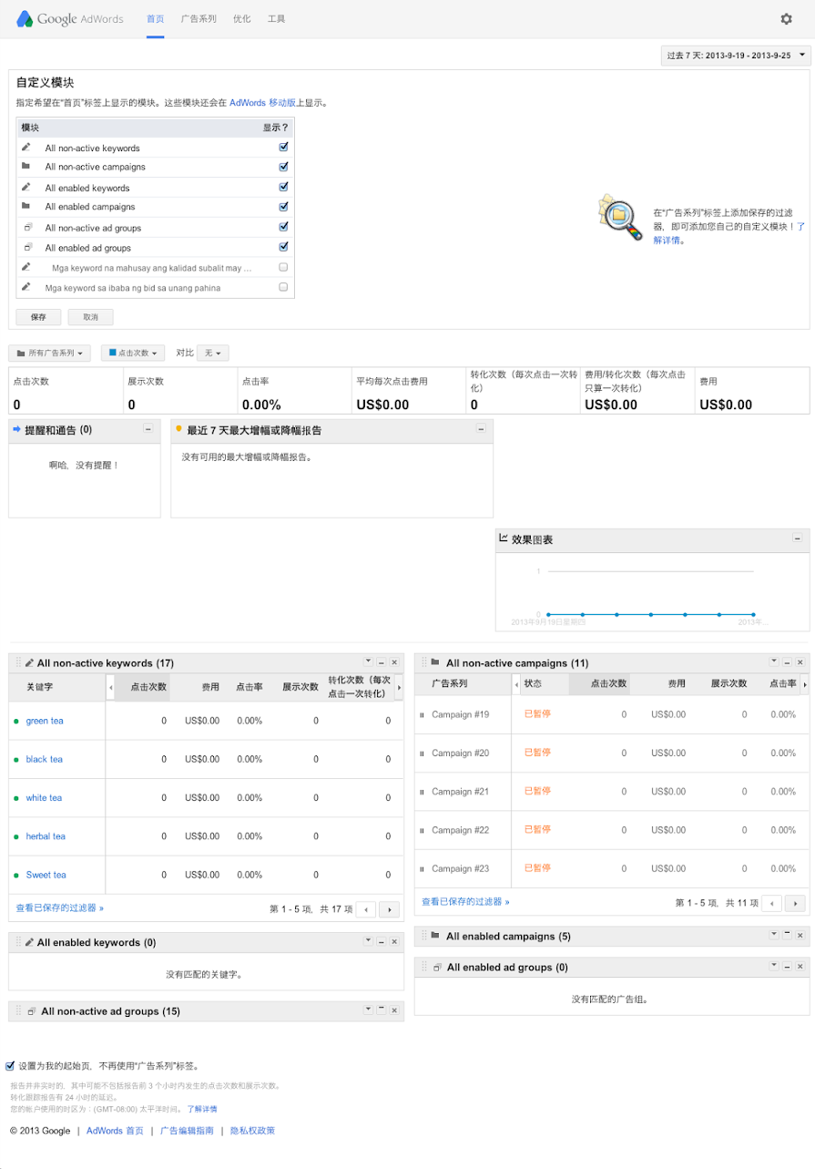 如您所知,AdWords 首页标签汇聚了许多与您的帐户相关的信息。在熟悉此标签之后,您可以对页面上的某些模块进行自定义,以便更好地监控广告的效果。